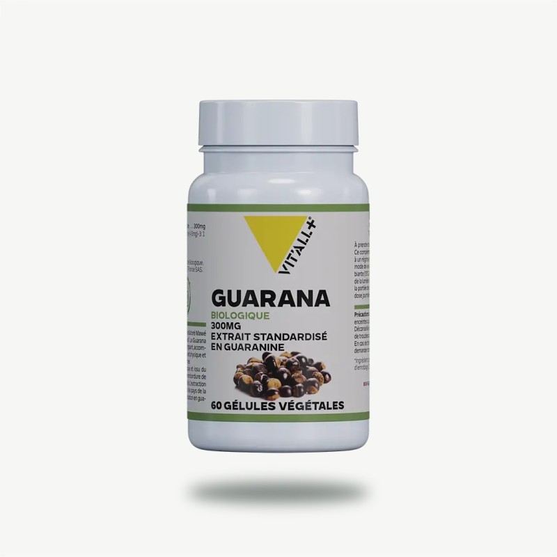 COMPOSITION POUR 1 GÉLULE : Guarana (Paullinia cupana) – graine – Extrait standardisé à 15% de guaranine – 3:1 – Biologique 300mg.